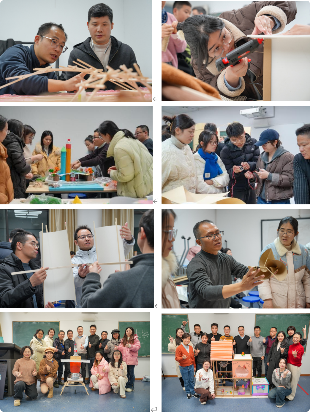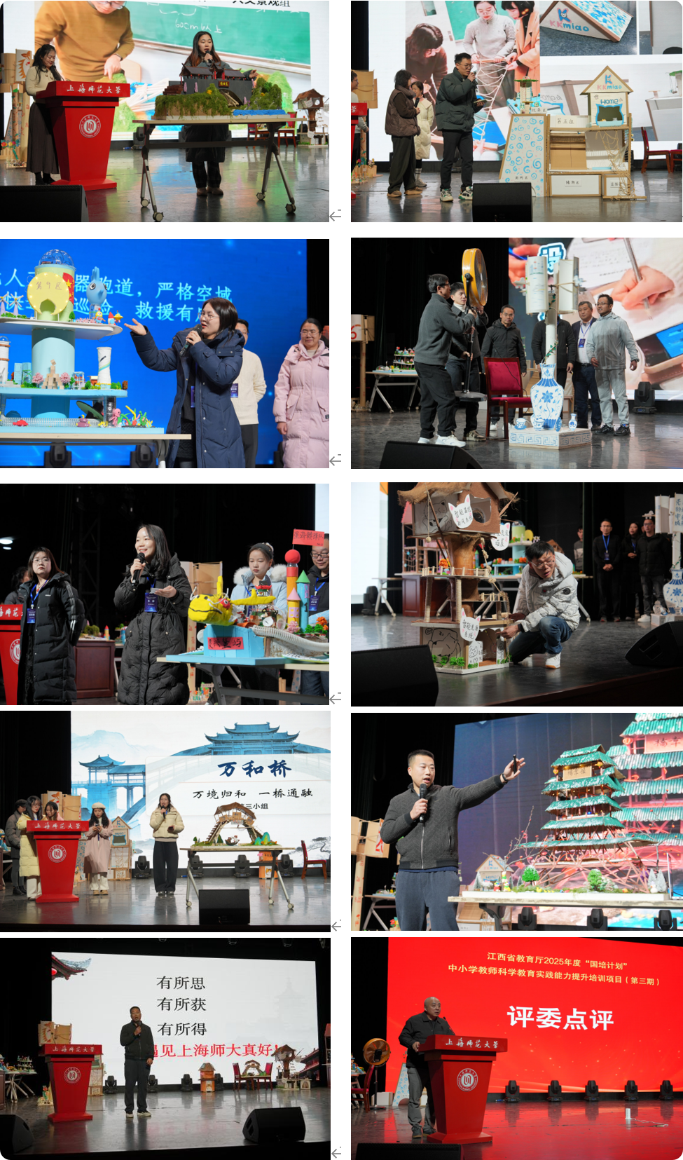 在江西阶段,培训聚焦理念更新与思维转型。上海师范大学耿步健教授作“奋楫扬帆启新程——学习领会党的二十届四中全会精神”专题报告;上海师范大学国际教师教育中心副主任王洁教授以“科技教育在学科实践中的可为与何为——从‘跨学科拼盘’到‘边界跨越’”为题,引导学员深入思考科技教育在学科教学中的融合路径。上海师范大学建筑工程学院的罗晶博士、朱美春教授、王英副教授分别围绕“从共情到落地:设计思维与工程思维”“从蓝图到原型:材料与技术的协奏”“从工程实践到教学设计:K12工程教育教学链”等主题开展专题讲座,为项目实践提供方法论支撑。学员们就“贯木拱桥”“智能喵屋”“未来城市”“风力发电塔”四大项目化学习课题,在导师指导下进行方案设计与初步实践,为后续深度制作奠定基础。