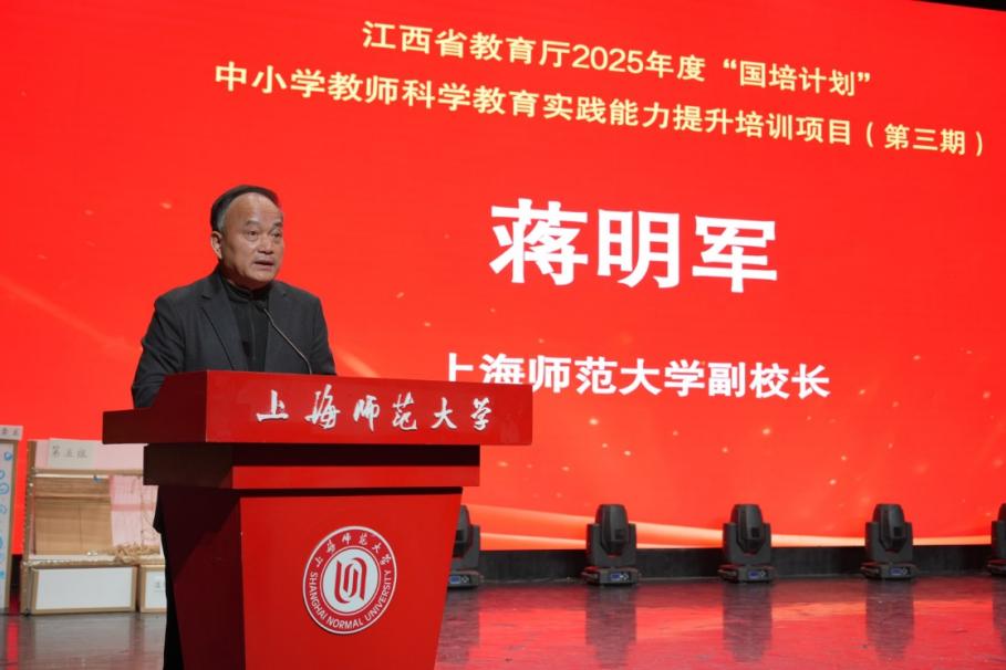 最后,上海师范大学副校长蒋明军发表致辞。他充分肯定本期培训的成效与学员的积极参与,勉励大家将所学的前沿理念、项目化学习方法与实践经验带回江西教学一线,成为推动科学教育课堂变革的种子力量,共同促进江西省科学教育水平全面提升。