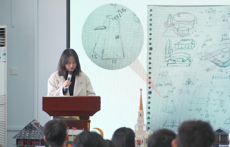 随后,工程管理专业的陈敏从项目协调视角,介绍了团队如何高效协作,完成人民大会堂与人民英雄纪念碑的组合创作。土木工程专业的吕妍文和李念则侧重技术攻坚,讲述了运用专业知识进行精密计算、手工打磨部件,以及将红色理念融入模型建造的过程。他们一致认为,这次比赛深化了他们对专业价值的理解,未来将在各自领域继续传承这份可触可感的红色精神。